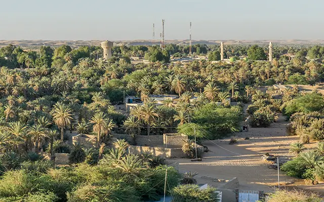 Oasis Agriculture: Evidenced by date palm groves, showcasing traditional farming methods adapted to the harsh desert environment.